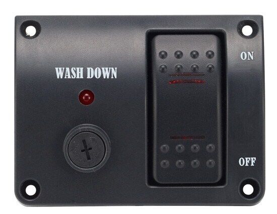 Includes modern design black plastic contoured plastic panel with "Wash Down" printed on it, on / off rocker switch with red indicator light and fuse holder with fuse.