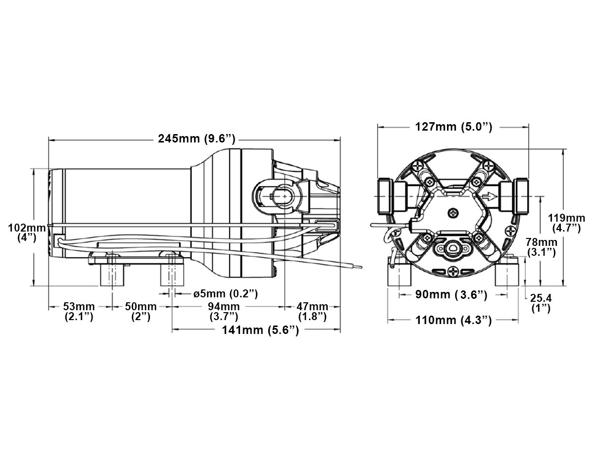 These HD (Heavy Duty) models include a wider diameter motor with a powder coated shell, cast aluminum endbells and lower housing to improve pressure capability and life. With an open flow rate of 5 GPM (18.9 LPM) and choice of either 40PSI (2.8 bar) or 60 PSI (4.1 bar), these pumps deliver exceptional performance. Standard models provide good performance in an economical footprint.