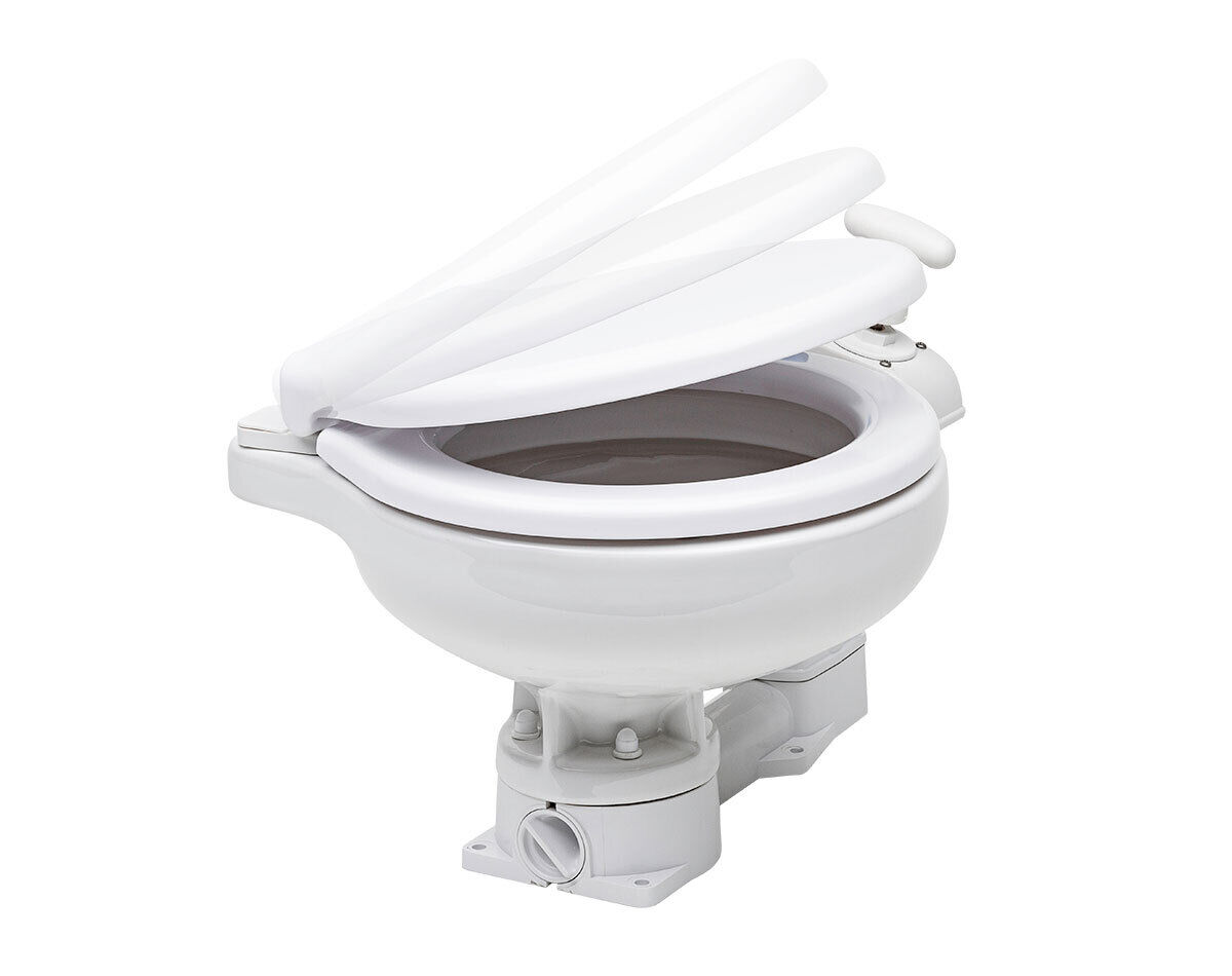 This manual toilet has a soft close seat to prevent any noise that could disturb the sleep and the peacefulness of the people onboard.