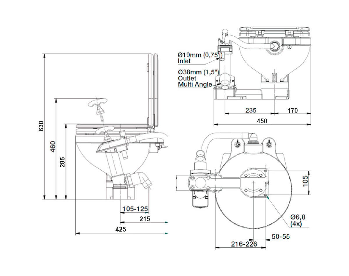 This manual toilet with space saving bowl features a manual angled pump with long stroke for more comfortable operation. Made of white vitreous porcelain, and with corrosion resistant parts throughout, it is silent, robust and easy to clean.