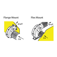 Blower is mounted on a flat bulkhead surface in highest part of compartment free from spray or deck wash. Use a suitable discharge fitting so that static pressure of blower will not be affected by change in wind direction. Route inlet ducting with as few bends as possible to lower 1/3 of the bilge compartment where vapors are likely to accumulate. Be sure ducting is positioned below top of engine stringers but not so low as to become submerged in bilge water. Locate pickup to take advantage of natural airflow direction.