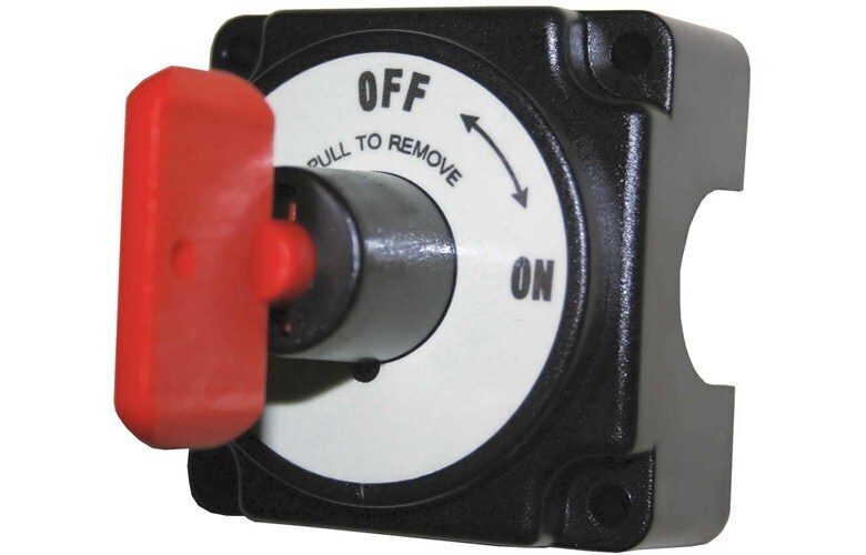 Very compact battery isolating switch with a high amp rating. Can be surface or flush mounted and features a removable key with rubber cap.