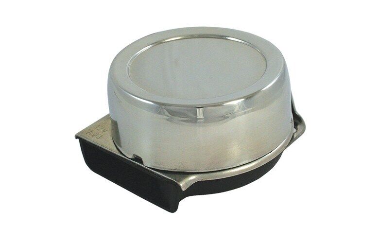 Compact marine horn with stainless steel cover and mounting base and non-corrosive black ABS plastic horn base.