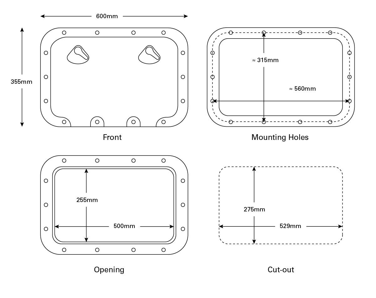 Write A ReviewClassic Access Hatch featuring a 180 degree door opening, strong recessed handle latches, neoprene lid seal and caps to cover the mounting holes.