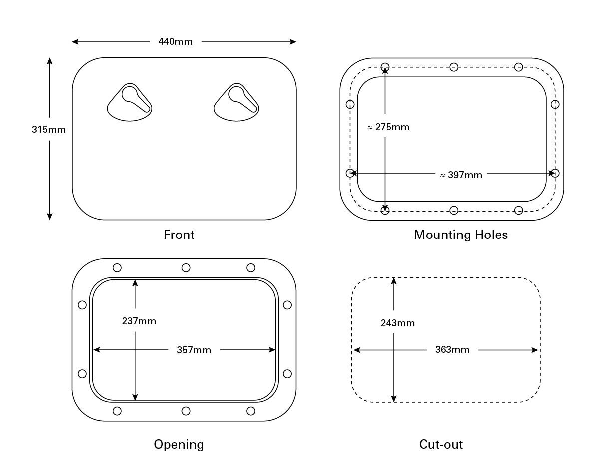 These deluxe hatches can be mounted vertically or horizontally, but not on the floor as they cannot be walked on. Designed for indoor or outdoor use, they are splashproof but not waterproof.