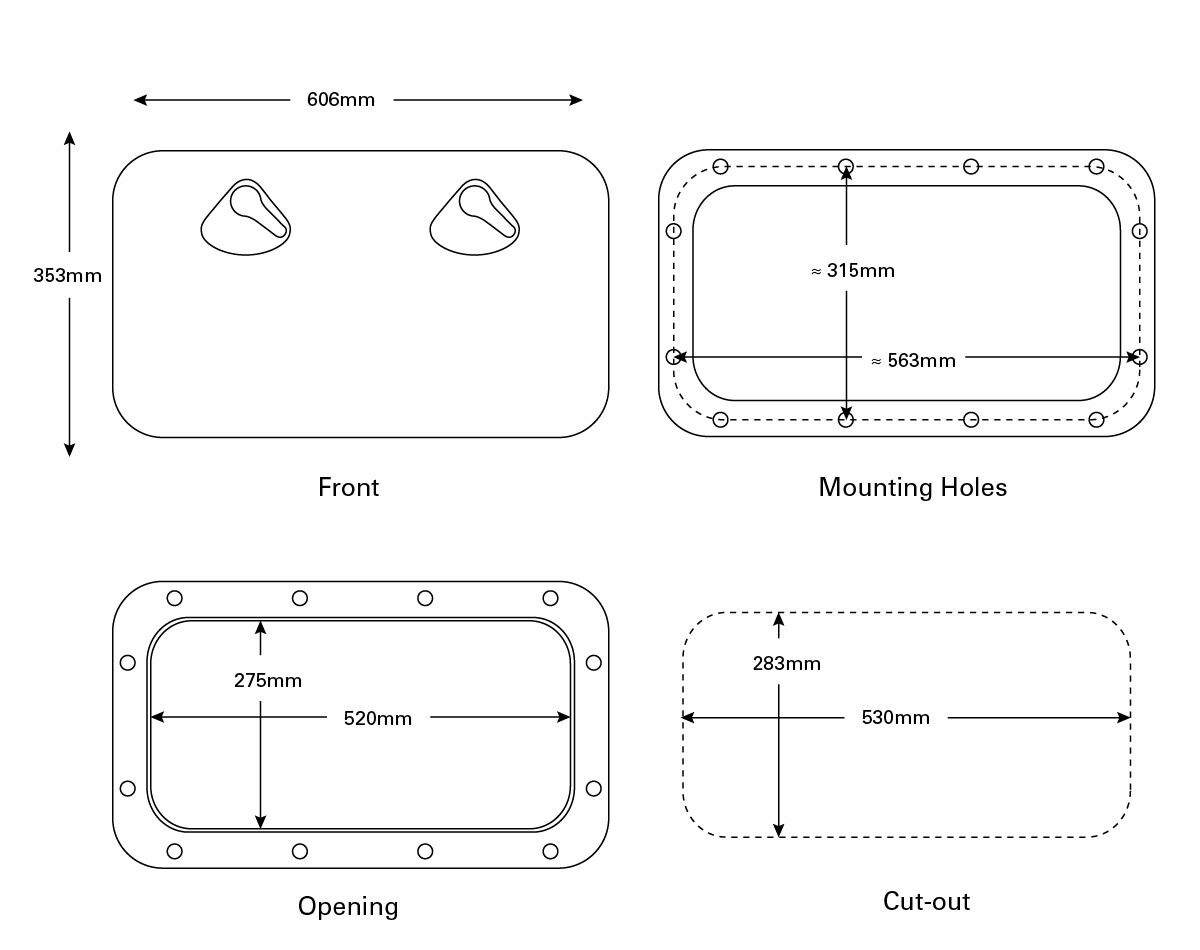 These deluxe hatches can be mounted vertically or horizontally, but not on the floor as they cannot be walked on. Designed for indoor or outdoor use, they are splashproof but not waterproof.