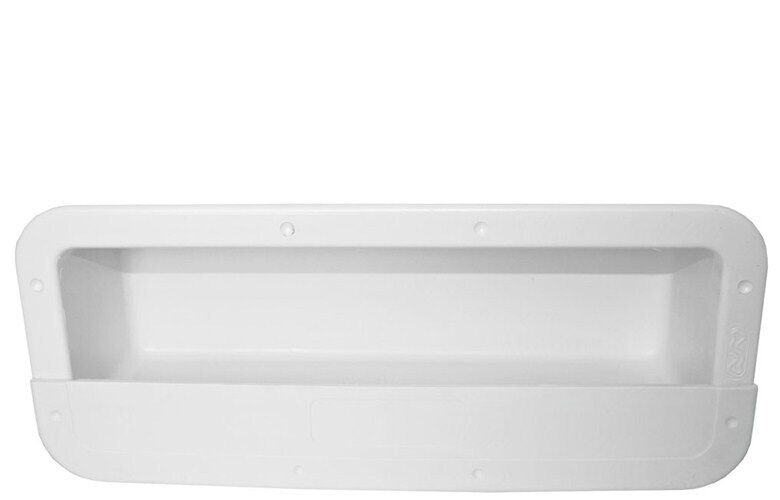White ABS plastic recessed box with flexible facia flange. Ideal for a recessed storage pocket in a dry or covered area.