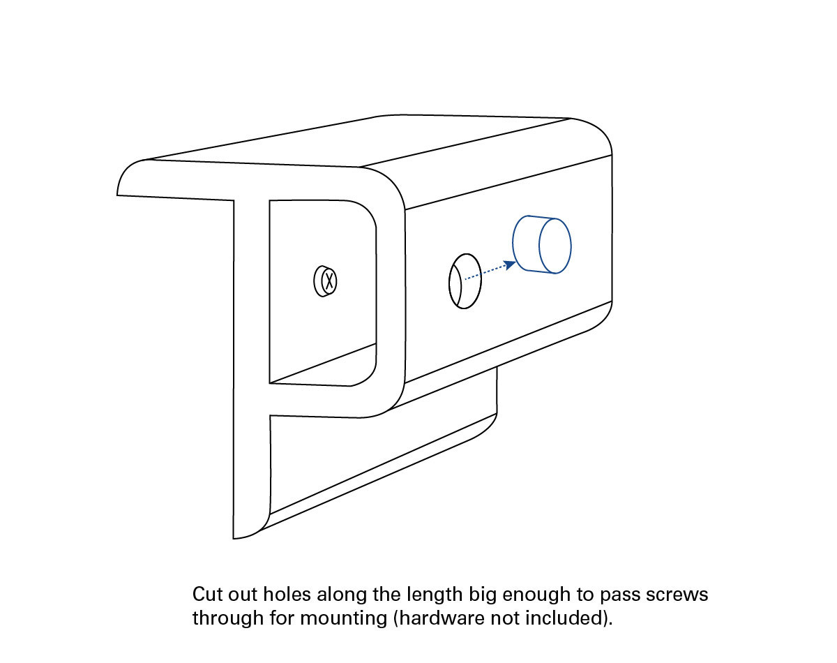 For mounting, we recommend drilling out small holes along the length of the fender to allow for screws to be passed through to the back "mounting plate". You can then either glue these cut out pieces back into the length, or leave open to allow for some water drainage.