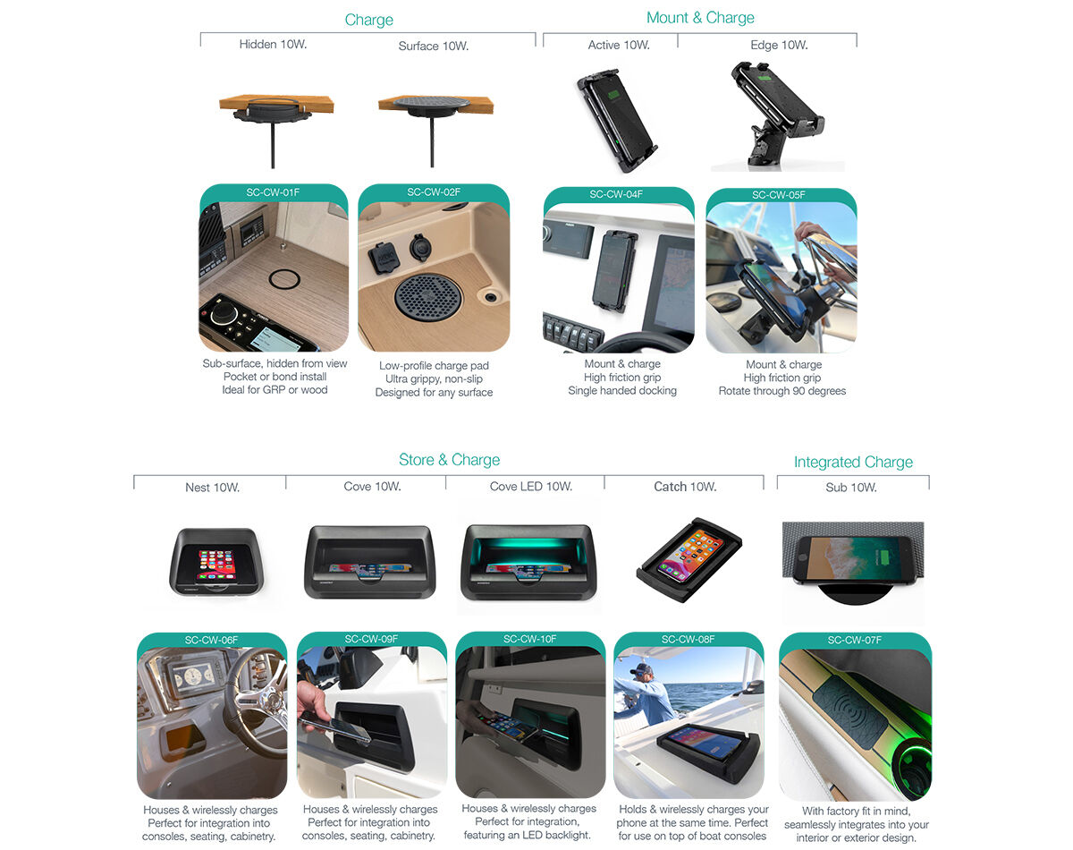 The fully waterproof 12/24V Qi certified waterproof wireless charging range enables phone charging for the marine environment, without the need for phone charging cables.