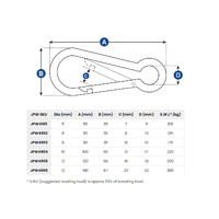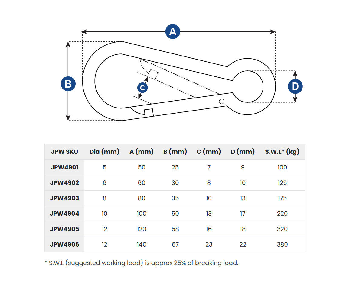 | Dia (mm) | A (mm) | B (mm) | C (mm) | D (mm) | S.W.L* (kg) |