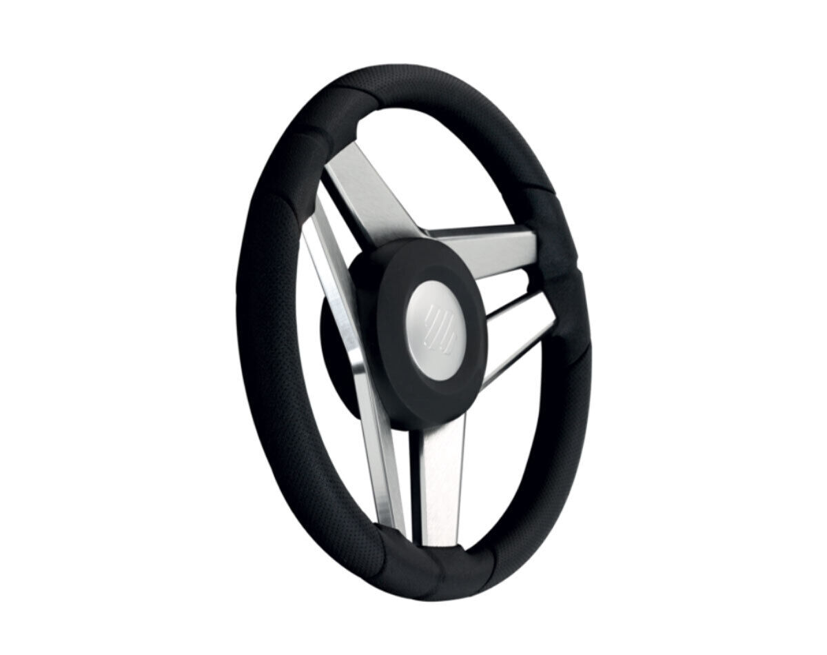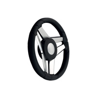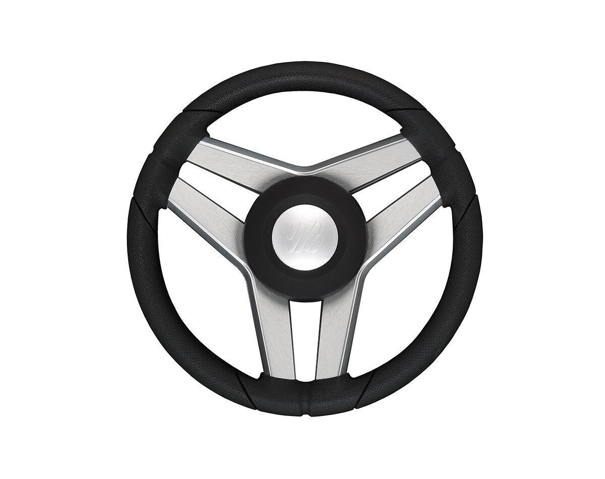 Write A ReviewThree equidistant spokes boat steering wheel with black polyurethane grip, brushed anodised aluminium spokes with polished edges and black painted cover & chrome plated cap.