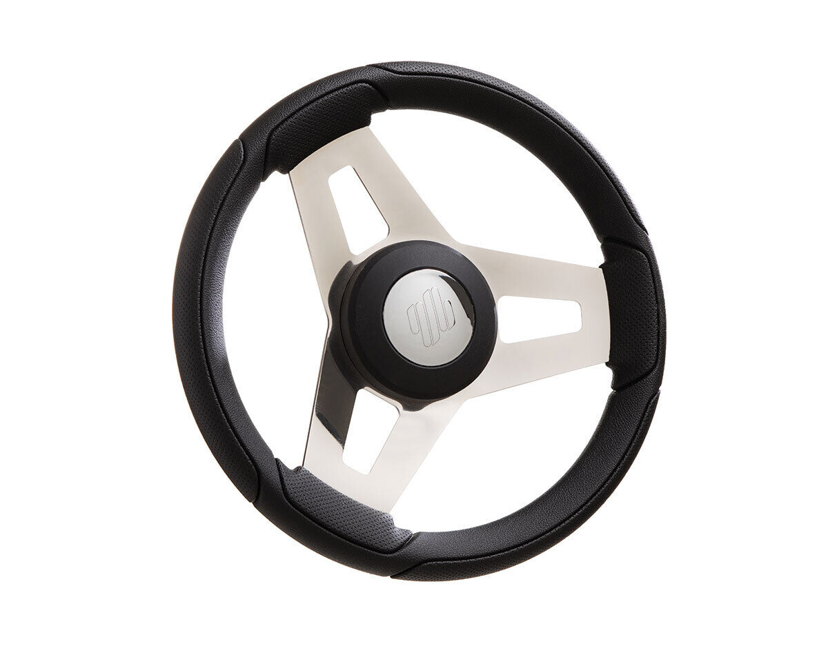 Write A Review3 spoke boat steering wheel with black polyurethane leather look grip, 304-grade stainless steel spokes and black painted center cap with chromed lens.