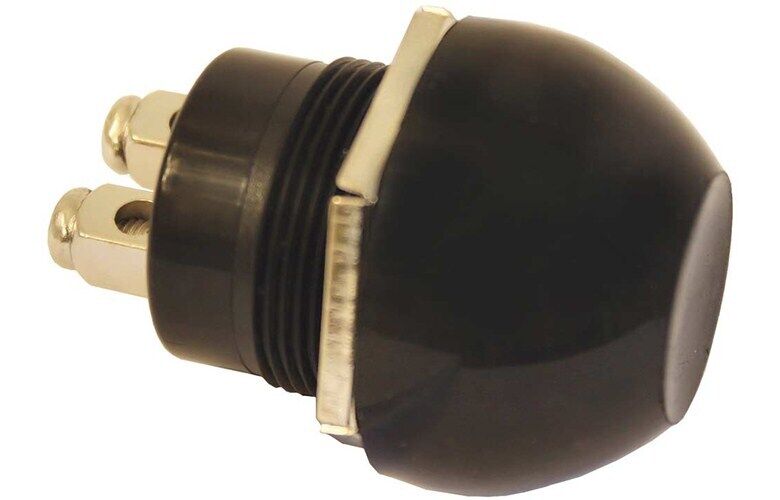 Compact push button momentary switch with rubber cap and chrome plated bezel and contacts. Push Button | Horn | Weatherproof | 12 or 24v | 8 amps