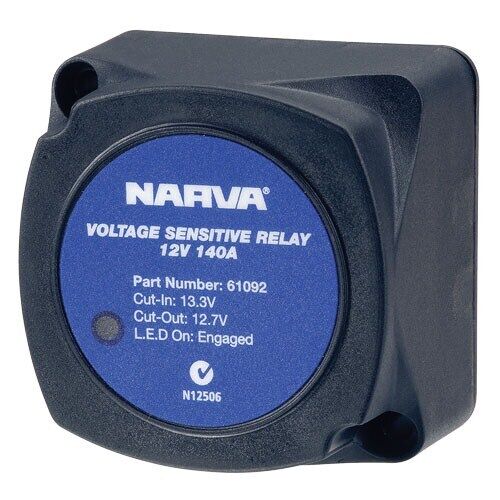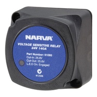 Narva voltage sensitive 12v relay with weatherproof body automatically connects and disconnects an appliance or circuit at the preset input voltage. Ideal for dual battery systems or to switch high current appliances.