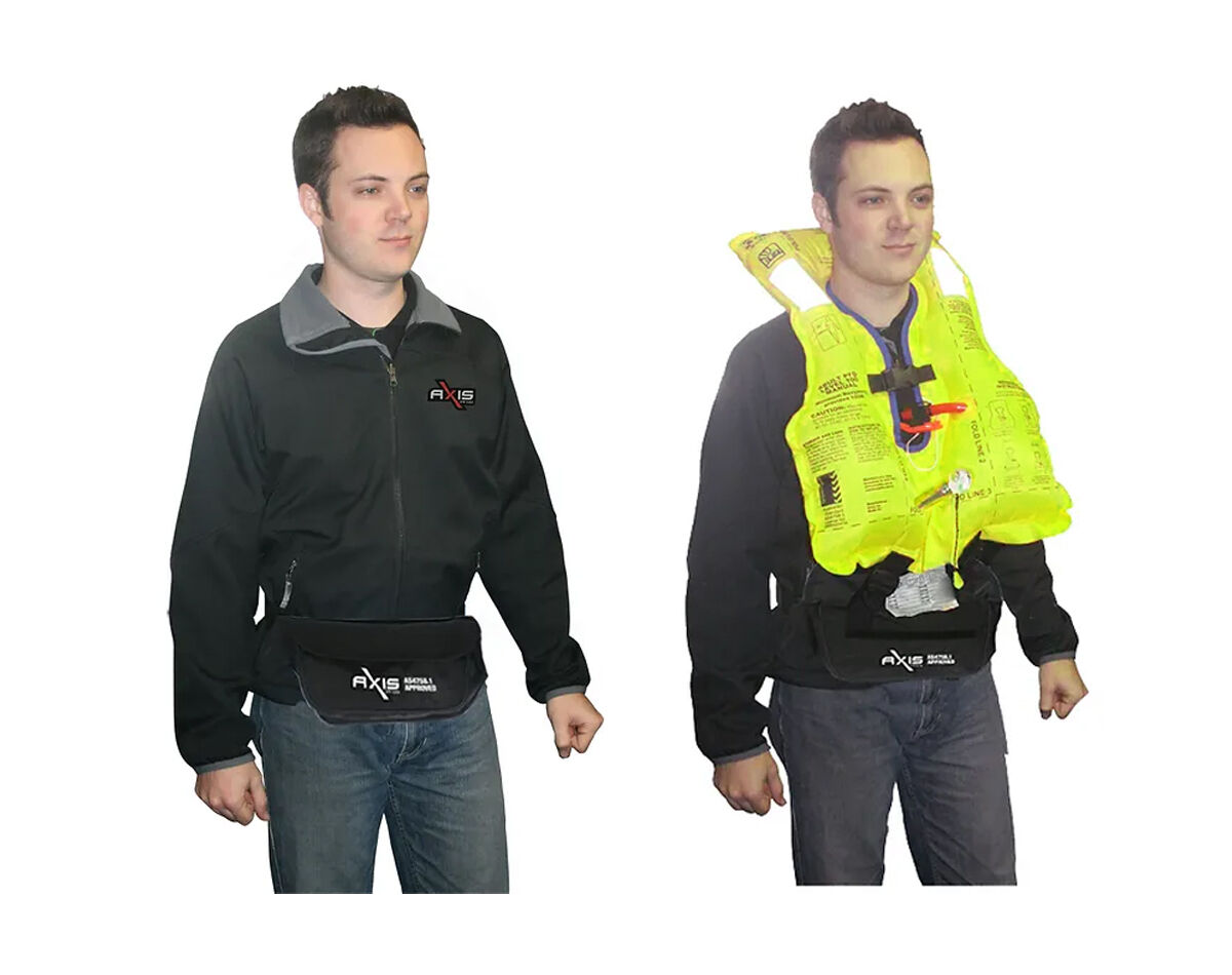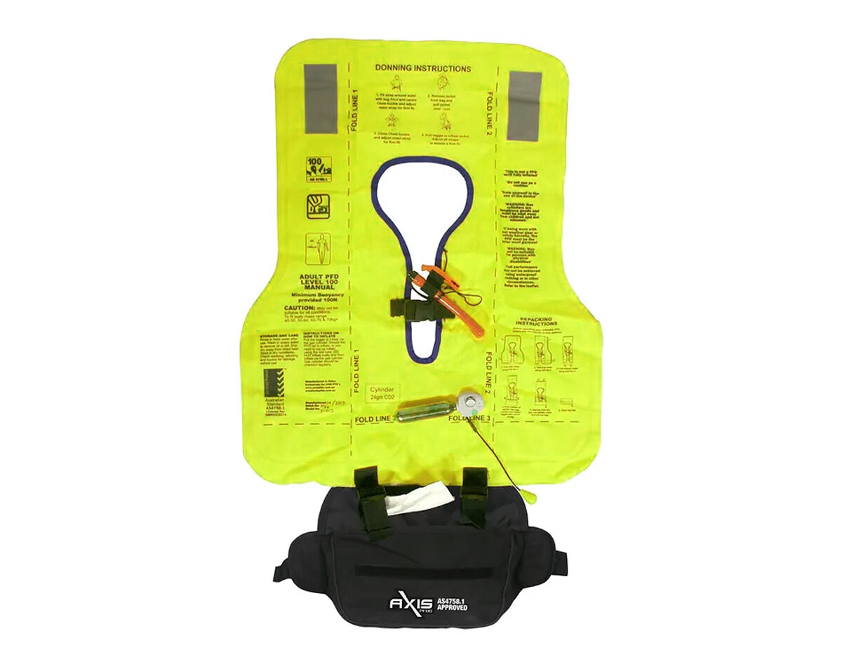 The Axis Level 100 Inflatable Waist Belt PFD is designed to be worn around the waist for easy movement while boating/fishing. The life jacket is only a PFD if the wearer is wearing the jacket and has been manually inflated.