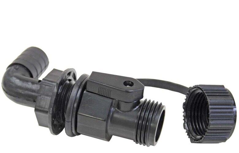 Black polypropylene non-corrosive thru-deck or bulkhead fitting complete with on / off valve and 90 deg barbed tail fitting.