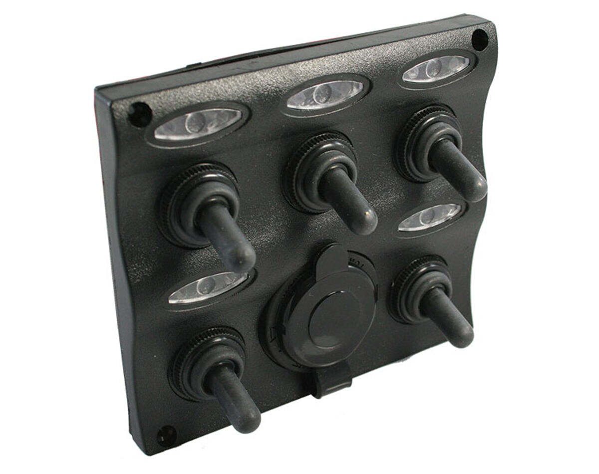 Write A ReviewThe "Wave" series water resistant moulded black panel includes fuses,LED indicators, labels and an incorporated cigarette plug socket. These and other "Wave" panels are all the same size so can be stacked above or below each other, or side by side to create a large bank of switches.